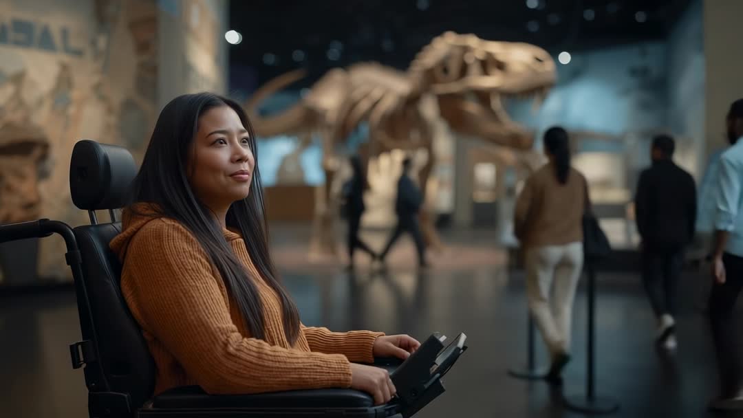 AI Generated Image. Video showing woman in wheelchair using joystick while observing T-rex skeleton in museum gallery. Camera pulling in slowly to emphasize wonder and engagement. Warm lighting creating inviting atmosphere and strong subject separation. Footage suiting accessibility campaigns, museum marketing, education videos, inclusive tourism promotions, adaptive technology demos, social media storytelling, corporate diversity training, non-profit outreach. Clip supporting themes of curiosity, learning, empowerment, mobility, cultural heritage, science education. Usage ideas: opening shot for museum website, hero banner for inclusion initiative, B-roll for documentary about paleontology or accessibility, background visual for blog post about inclusive travel, promotional spot for adaptive device manufacturers.