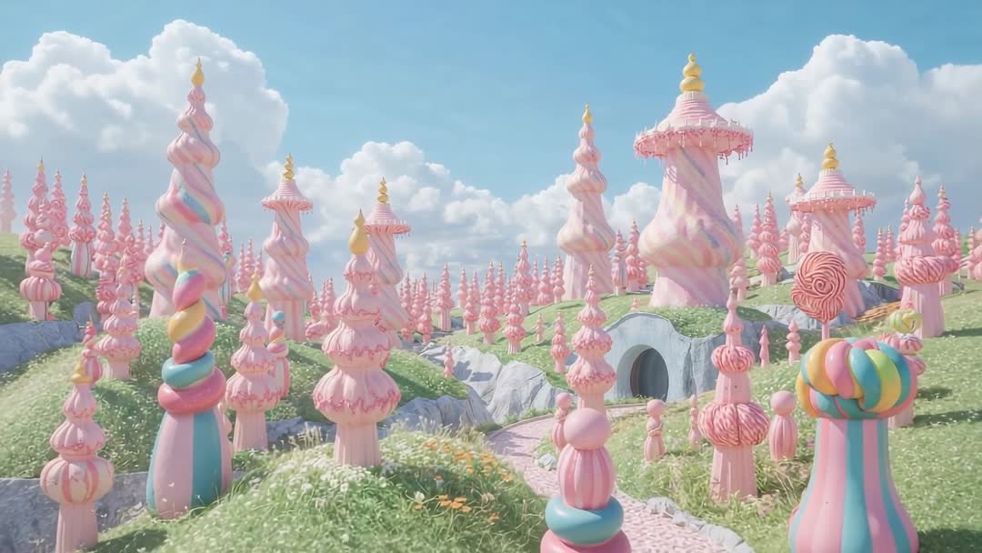 - Whimsical Candy Forest with Pastel Sculpted Trees and Pathway