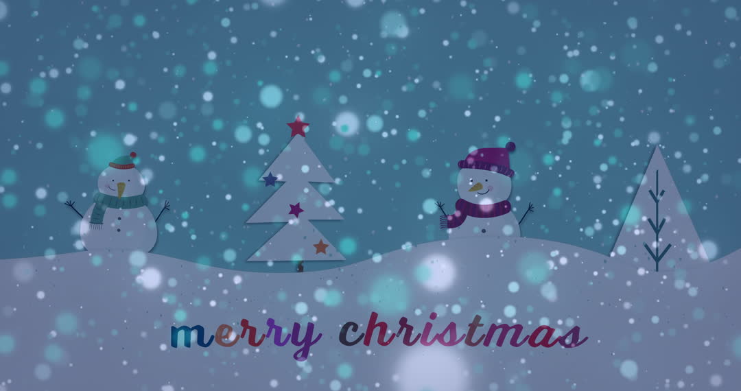 This cheerful and festive videory depicts a playful winter scene featuring two snowmen wearing hats and scarves alongside a stylized Christmas tree adorned with stars. The snowy landscape and falling snow create a magical, serene atmosphere. 'Merry Christmas' in colorful text sprawls across the bottom, making it an ideal choice for holiday greeting cards, seasonal advertisements, and social media posts wishing warmth and joy during the festive period.