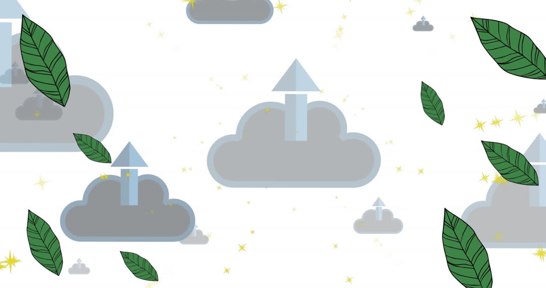 Graphics with grey clouds and green leaves scattered on digital white background, featuring small stars for an enchanting aura evoking charm and animation ranks often used in design placeholders versatile for backgrounds and digital presentations.