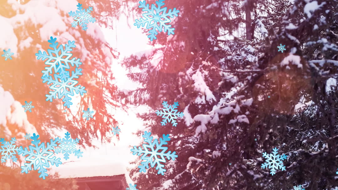 Magical winter scene with animated blue snowflakes falling over snow-covered fir trees creates festive and traditional atmosphere. Ideal for Christmas promotions, winter-themed content, and festive holiday backgrounds.