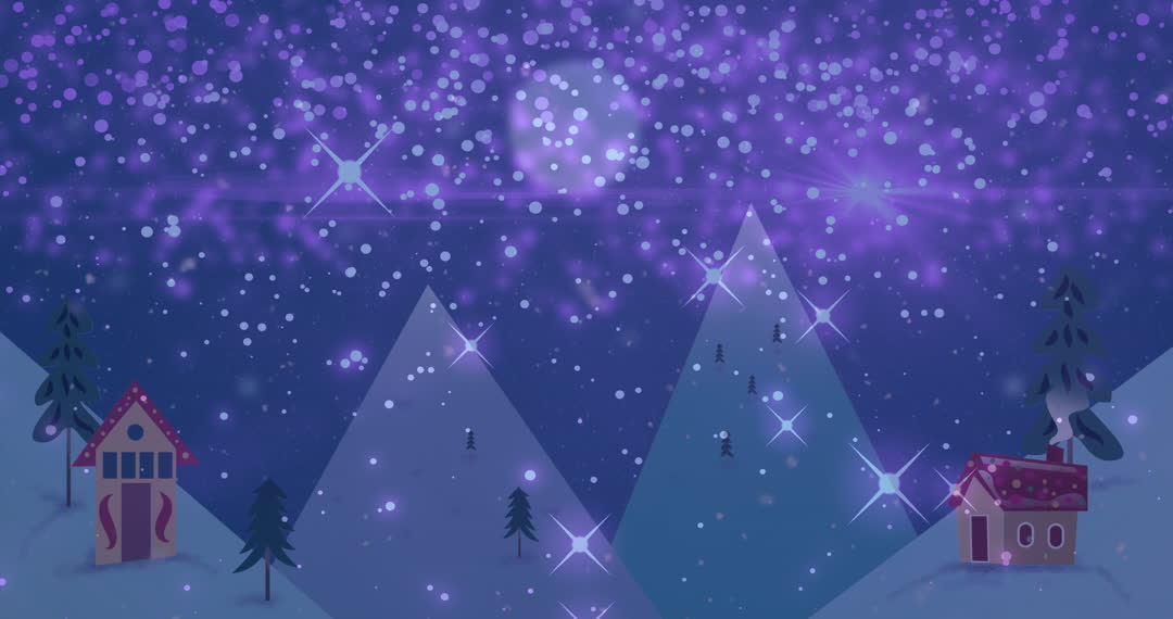 Charming winter scene with snowflakes gently falling against purple moonlit sky. Stars twinkle above mountains and snow-covered cottages with festive trees creating fantasy ambiance. Perfect for Christmas themes; backgrounds for holiday events, greeting cards, and celebratory designs.