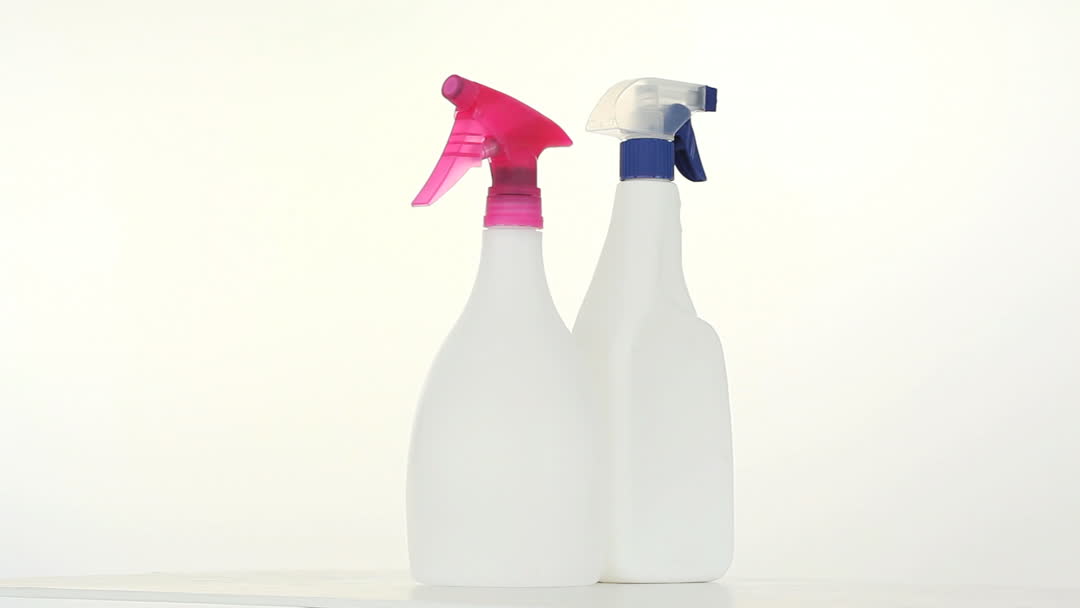 This video features two plastic spray bottles with varied caps, creatively angled to give the illusion of motion. The plain white background accentuates the products, making them ideal for marketing home cleaning supplies or environmentally friendly packaged goods. This video suits corporate presentations or content on eco-friendly cleaning tools.