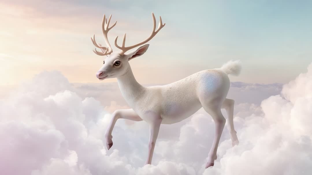 AI Generated Video. Video showing white stag prancing on cloud platform under pastel sunrise sky, antlers catching warm light and hooves pausing on soft cloud. Composition blending fantasy and natural beauty, creating tranquil, otherworldly atmosphere ideal for storytelling and visual branding. Serving well in fantasy film openers, book trailers, social media campaigns, wellness and meditation apps, seasonal holiday promotions and inspirational presentations. Soft pastel palette and voluminous cloudscape creating dreamy mood; slow-pan or subtle motion graphics enhancing majestic flow. Suiting editorial and commercial projects seeking magical, whimsical or spiritual tone; color grading easily adjustable for warmer or cooler looks.