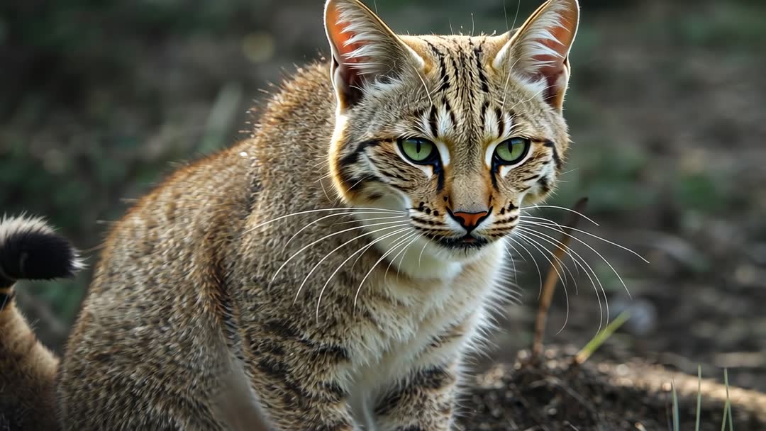 AI Generated Image. Video showing wildcat-like feline turning head toward camera while pausing on grassland edge, whiskers twitching and green eyes locking on lens. Close-up framing highlighting tawny tabby coat, pointed ears, long whiskers, textured fur and alert expression. Slow camera pan or handheld follow offering extended clip variations and subtle movement for editing flexibility. Working well for wildlife footage, nature documentary clips, educational segments on feline behavior, animal conservation campaigns, blog headers, social media reels and advertising for outdoor or pet brands. Suitable for overlaying text, adding voiceover, inserting into montage of predator behavior, or using as hero clip for website banners. Providing high-impact visual for storytelling about wildlife adaptation, habitat preservation, animal behavior studies, or dramatic short-form content. AI-generated tag included for licensing transparency.