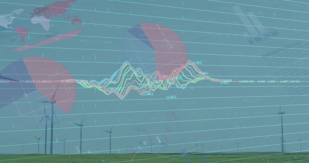 Visual representation of wind turbines in an open field, layered with dynamic line graphs depicting data trends. Ideal for use in projects focused on renewable energy, technology integration, sustainable development, or environmental awareness presentations.