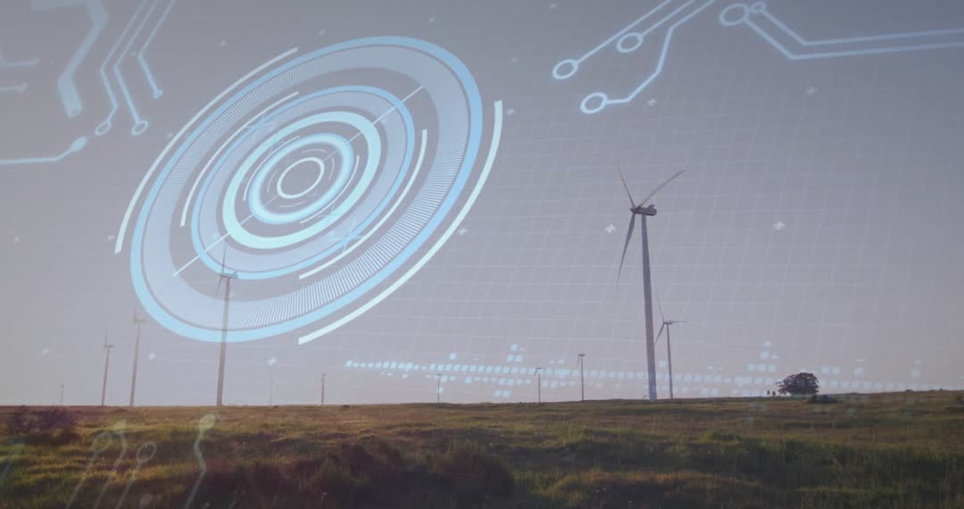 Image combining wind turbines on grassland with digital overlay of a modern HUD interface. Highlights the intersection of renewable energy and advanced technology, promoting sustainability and environmental innovation. Suitable for content related to green technology, environmental policies, and sustainable energy solutions.