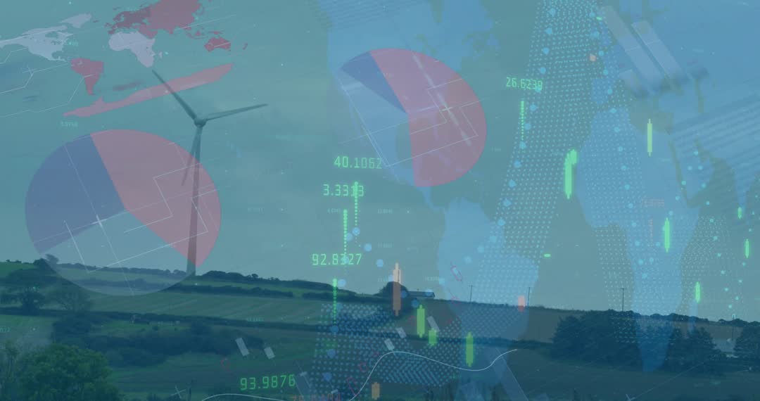 A wind turbine rotates on a hill ridge, layered with digital data elements such as pie charts and candlestick charts amidst a world map background. This modern video juxtaposes sustainable energy with data visualization, highlighting trends in renewable energy innovation. Suitable for topics on environmental technology, clean energy solutions, and advancements in sustainability reporting, this representation underscores the fusion of technology and natural landscapes, perfect for use in presentations, reports, and educational materials on green initiatives.