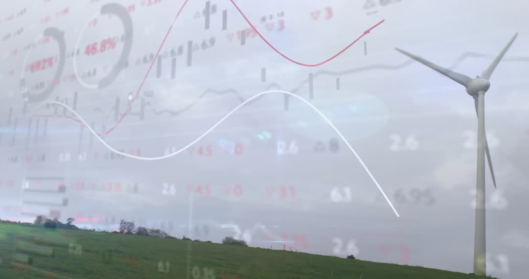 Overlay of statistical data and fluctuating trends with a wind turbine in open field captures the intersection of renewable energy and data analytics. Useful for illustrating topics of sustainable technology, renewable energy advancement, and the importance of analytics in the environmental sector.