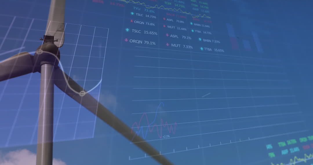 Visual depicting a wind turbine with overlaid digital graphs signifying renewable energy and financial data analysis. Communicates themes of sustainable technology and economic growth. Suitable for content relating to clean energy investments, technological advancements, and market analysis.
