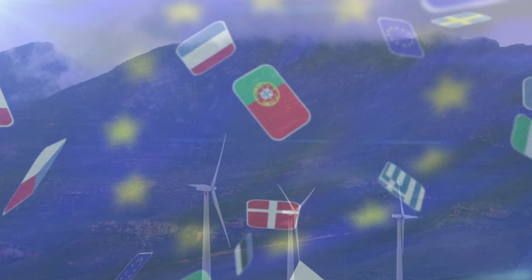 Renewable wind energy concept portrayed against mountain background with animated EU country flags adds a European spirit. Suitable for illustrating articles, reports, and campaigns related to sustainable energy, environmental protection, European partnerships in green initiatives, and insightful material regarding international cooperation in renewable sectors.
