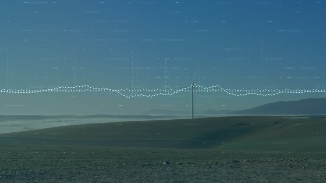 - Windfarm energy monitoring video showing sensor waveform overlay across misty arid horizon