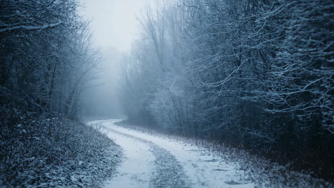 AI Generated Video. Moody winter footage showing winding snow-covered track with parallel tire tracks disappearing into dense fog among bare trees. Cool blue tones and soft diffused light creating atmospheric, cinematic mood. Ideal for background clips in film openers, nature documentaries, weather reports, seasonal commercials, travel blogs, and social media reels. Working well for overlays, title intros, looped backgrounds, and scene transitions. Color grading with teal-blue palette and subtle vignette enhancing cold, isolated feeling. Useful for conveying solitude, mystery, winter travel, rural landscape, or introspective storytelling.