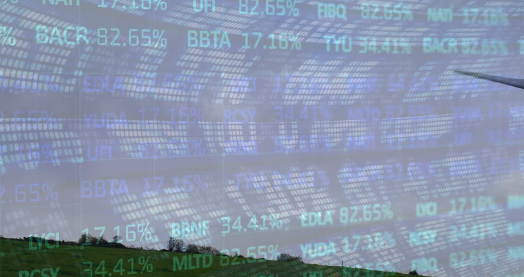 This visual combines the digital display of financial data with the video of a windmill, symbolizing the intersection of sustainable energy and financial markets. It captures the essence of modern technology and eco-friendly solutions merging with financial innovation. Useful for topics focused on green investment, financial technology advancements, sustainable development, or energy market analysis.