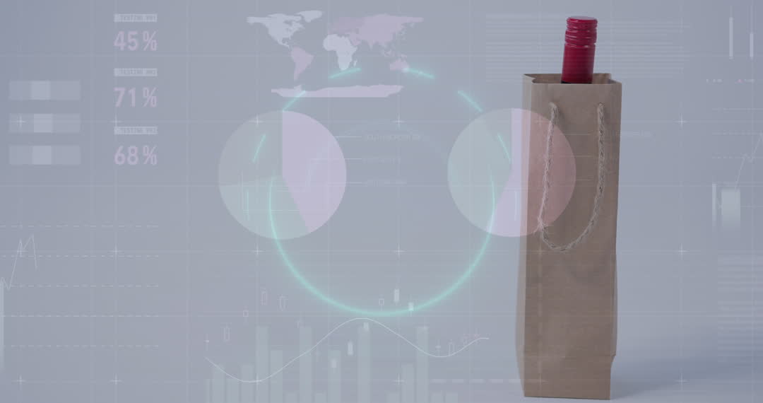 Versatile for illustrating modern business concepts, this video displays a wine bottle in a shopping bag in front of animations depicting global financial graphs and technological data. This representation offers business or fintech brands an engaging way to visualize commerce or economic topics.