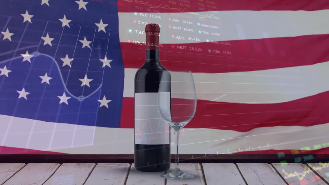 This video creatively combines a wine bottle and empty glass with the background of U.S. Flag overlaying financial stock graphs. Ideal for illustrating concepts related to American business culture, trade, financial prosperity, or the intersection of lifestyle and economy.