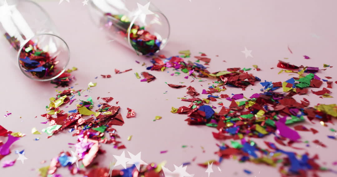 Multicolored confetti spread across pale pink background, spilling from upturned wine glasses with star animation overlay adds whimsical, festive touch. Suitable for party invitations, celebration announcements, New Year’s promotions, and themed decorations to evoke joy and excitement.