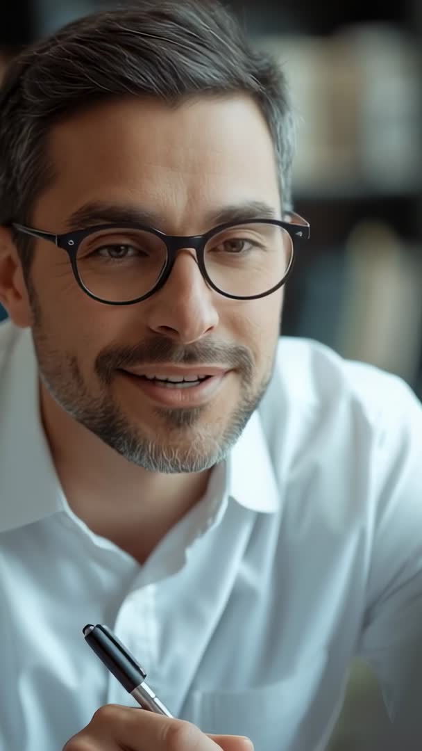 AI Generated Image. Close-up vertical video showing winking professional raising pen while speaking to camera, conveying confident and friendly tone. Eyeglasses, trimmed beard, white shirt creating polished modern look. Soft office background with shallow depth of field keeping focus on face and gesture. Footage working well for corporate training clips, virtual meeting tutorials, client consultation promotions, executive branding, e-learning modules, social media reels, app onboarding, testimonial segments, and promotional ads. Use for thumbnail, banner, or cutaway clip during voiceover. Color grading and slow-motion editing enhancing expressive gesture. Licensing options recommended for commercial and editorial use.