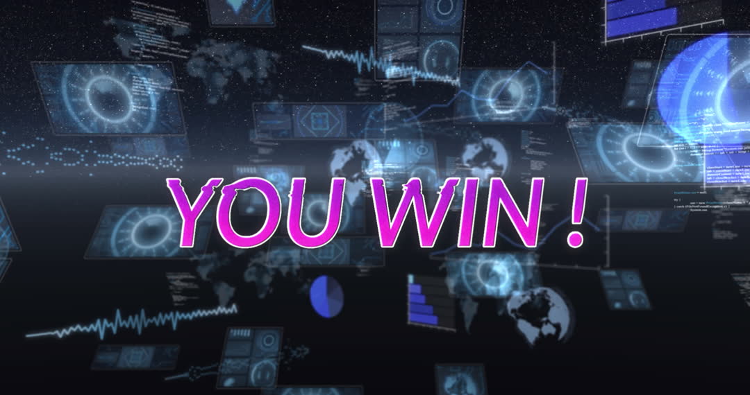Futuristic animation showcasing 'You Win' text with data processing visuals in the background. Ideal for gaming interfaces and victory screen visuals. Suitable for tech-themed celebrations and digital events branding.