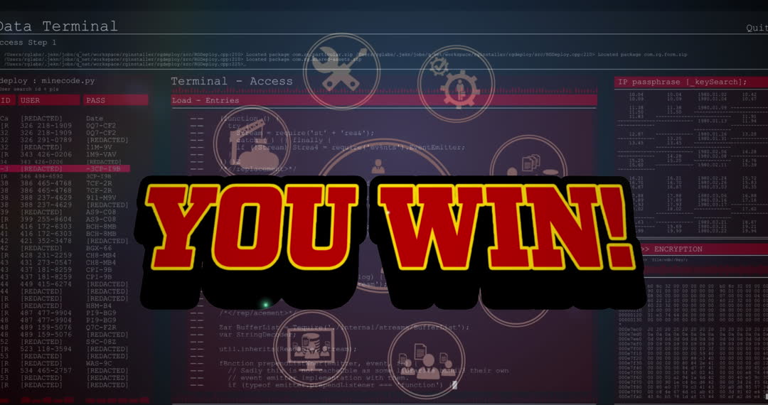 This animation presents an exciting depiction of victory with a bold 'You Win' message against a background featuring digital data processing elements. Ideal for computer literacy events, cyber game wins, and tech-based victorious moments.