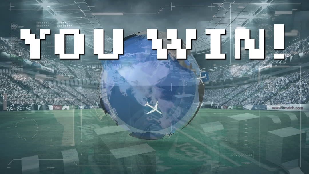 Dynamic illustration featuring 'You Win' text with a globe and airplane against stadium backdrop. Represents themes of victory, globalization, and technology in sports and gaming. Ideal for use in advertisements, branding material, or content focusing on sports industry, transportation or digital influence in modern media.