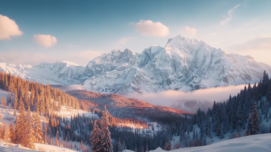 AI Generated Video. Stunning winter daybreak scene, displaying snow-covered peaks radiant in early sunlight. Swirling mist drifts lazily through evergreen-covered ridges within imperious mountain range, resulting in peaceful contrast between icy environs. Features idyllic wilderness beauty of alpine sunset, exuding atmosphere optimal for winter travel, digital backgrounds highlighting snow sports allure, serene winter or nature lover literary themes backdrops, or motivational and inspirational purposes—all illumining awe-inspiring outlook on environmental unspoiled places.