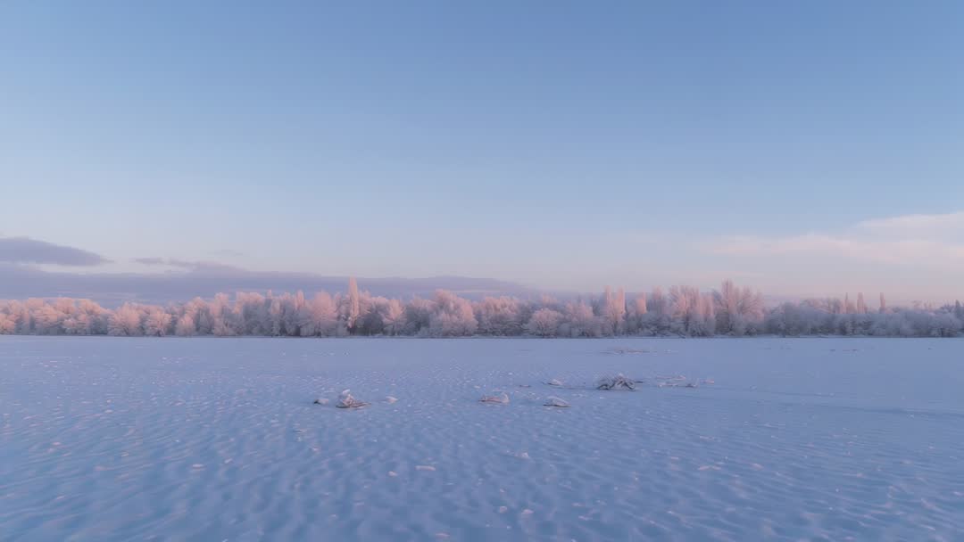 AI Generated Video. Panoramic winter dawn video capturing vast snow plain leading to frosted treeline bathed in soft pink light. Low-angle sunlight warming frost on branches and creating long, gentle shadows across rippled snow mounds. Color palette blending icy blue tones with warm pastel pinks for tranquil, minimal mood. Suitable for winter travel promos, seasonal website banners, nature documentary background footage, meditation and wellness videos, social media headers, environmental campaign visuals, and calendar or print layouts. Working well as loopable background or slow pan for titles and product overlays. Featuring wide aspect ratio and clean horizon space for copy placement and lower-third graphics. If AI-generated, include appropriate tagging for licensing clarity.