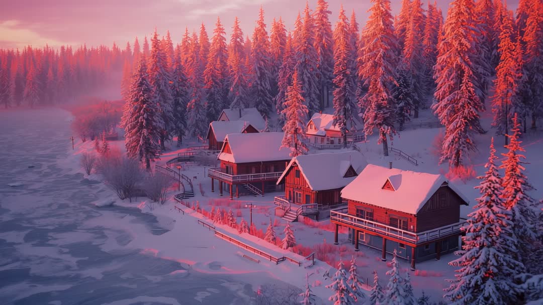 - Winter Dusk Over Frozen Lake and Snow-Laden Cabins