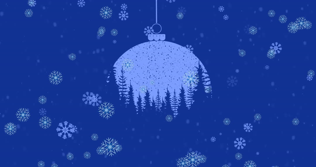 Serene blue backdrop featuring a hanging Christmas bauble adorned with a winter landscape print, surrounded by falling snowflakes. Ideal for holiday greeting cards, festive social media graphics, seasonal invitations, or winter-themed promotional materials.