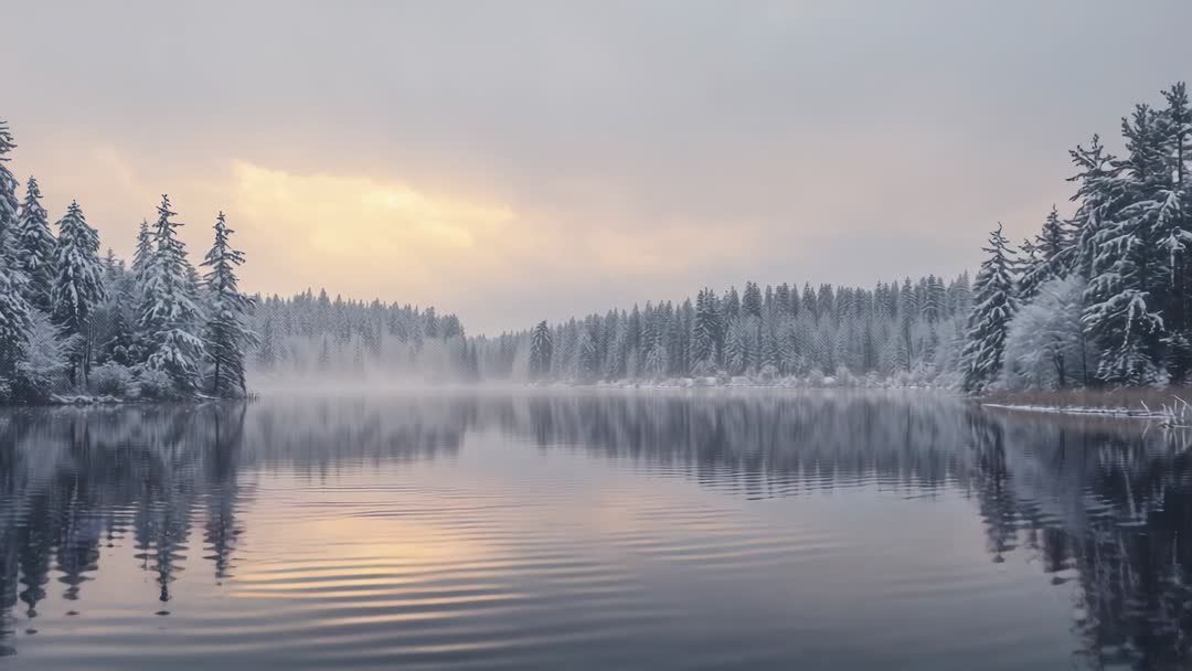 AI Generated Video. Video showing expanding ripples crossing calm winter lake while snow-laden evergreens reflecting in glassy water. Warm sunrise glow piercing low mist, creating soft pastel palette and subtle contrast with cool tones. Composition centering on horizon with strong symmetry and gentle leading lines from ripples. Ideal for nature documentaries, travel promos, wellness and relaxation content, seasonal marketing, website hero banners, background loops for apps, social media reels. Editing suggestions: slowing footage or applying speed ramp to emphasize ripples, color grading to enhance warm-cool contrast, adding ambient piano or soft synth pad for mood, overlaying text or logo in upper sky area. Pairing ideas: combining with aerial forest shots, close-up footage of snow on branches, or wildlife cutaways for variety. Licensing use cases: landscape and seasonal campaigns, calming visual backgrounds, editorial features on winter travel and outdoor recreation.