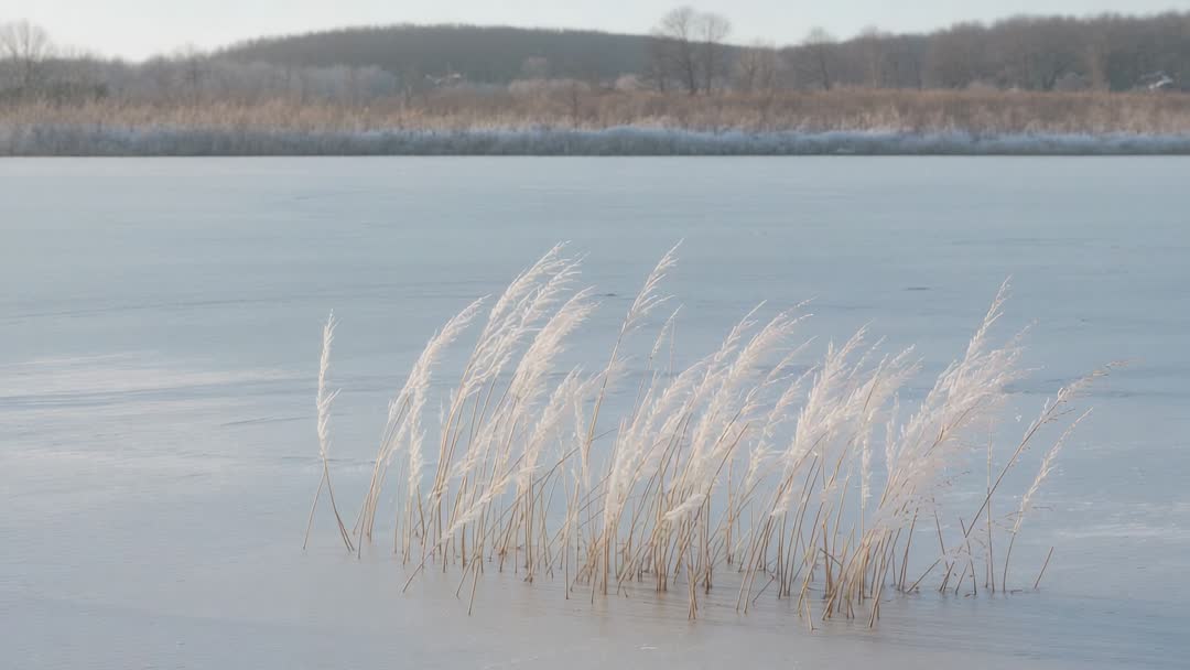 AI Generated Video. Showing cluster of tall marsh reeds bending and swaying across frozen lake under pale winter light, creating slow rhythmic motion for calming visual sequences. Capturing gentle wind tracing feathery seedheads and casting soft reflections on ice, providing minimalist foreground against distant low-contrast tree line. Featuring soft blue-gray palette and muted tones, offering ample negative space for text overlays and lower thirds. Suiting background loops for wellness and meditation apps, website headers, seasonal marketing, nature documentaries, and environmental campaigns. Working well as B-roll for climate stories, conservation messaging, travel features, or greeting cards. Recommending gentle slow-motion playback and subtle color grading to enhance mood; recommending crop to widescreen for cinematic framing and leaving space for headlines.