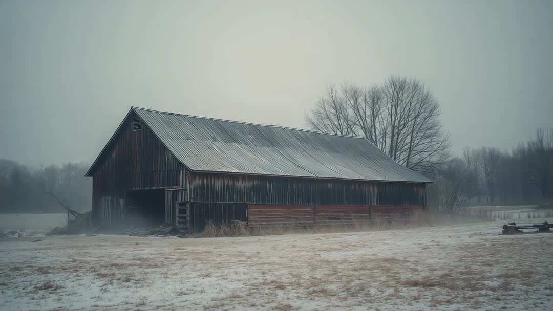 AI Generated Video. Showing slow drift of mist and light snow settling around weathered wooden barn on frost-covered field. Conveying moody, cinematic atmosphere with muted blue-gray tones and bare winter trees. Working well for background footage in film, documentary, commercial, or web projects that require rural, lonely, or seasonal mood. Supporting headline banners, social media posts, blog headers, book covers, promotional videos for winter tourism, agricultural history pieces, real estate renovation stories. Allowing text overlays or lower-third graphics thanks to open foreground and negative space. Delivering versatile loopable motion for ambient background use. Suitable for 16:9 widescreen, 4:5 social, 9:16 vertical crops, and slow-motion edits.
