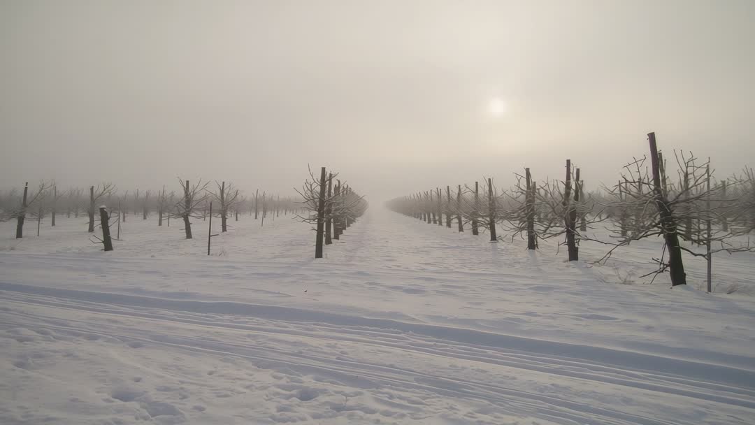 AI Generated Video. Clip showing long rows of pruned fruit trees stretching into fog over snow-covered ground, sun peeking through mist while packed tracks cross foreground. Strong leading lines and symmetrical composition creating deep perspective and minimalist winter mood. Color palette featuring muted neutrals and soft warm glow from sun, suitable for toning toward colder or warmer mood. Perfect for background use in winter-themed commercials, agricultural videos, orchard management tutorials, seasonal website banners, print calendars, and editorial pieces on farming or climate. Ideal for slow cinematic pans, gentle crossfades, title overlays, or looped ambient backgrounds. Recommend using 24 or 30 fps, subtle color grading to enhance contrast, and ambient wind or soft piano for soundtrack. Frame offering quiet, contemplative atmosphere for storytelling about seasonality, land stewardship, or rural solitude.