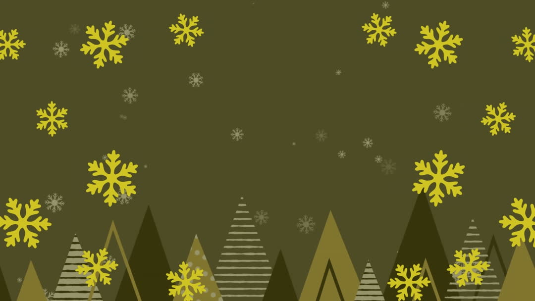 Green backdrop with stylized tree shapes scattered across bottom while gold and white snowflakes fall gracefully throughout. Suitable for holiday greeting cards, Christmas-themed presentations, social media posts, seasonal marketing campaigns