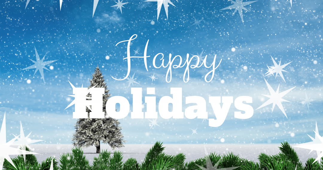 Enchanting winter scene featuring classic holiday message 'Happy Holidays'. Snow-like stars fall against dreamy winter landscape with a single frosted fir tree. Perfect for holiday cards, festive invitations, seasonal promotions, and social media posts from late November through the end of year festivities.