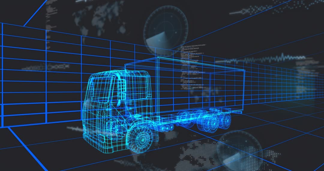 - Wireframe 3D truck navigating digital logistics corridor with HUD data overlay