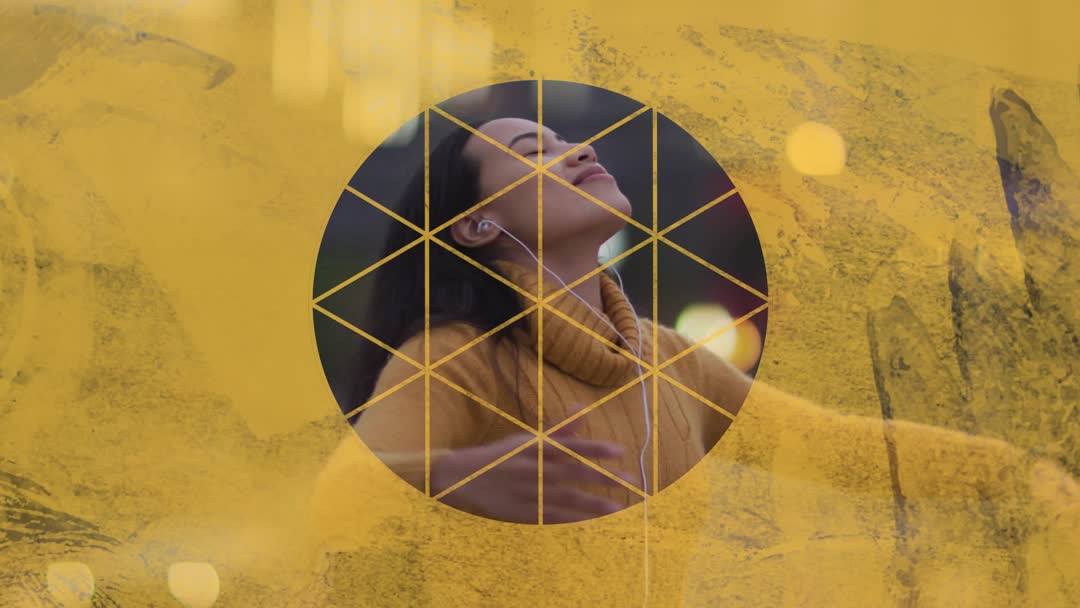 - Woman adjusting earbud and leaning into golden city lights through geometric circle