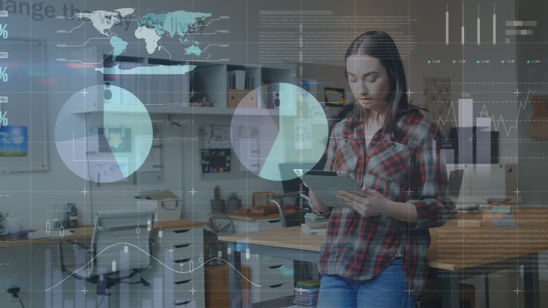 A woman stands in an office using a tablet while various financial graphs and data visualizations are superimposed. Ideal for illustrating themes of modern business technology, data analysis, and economic strategy.