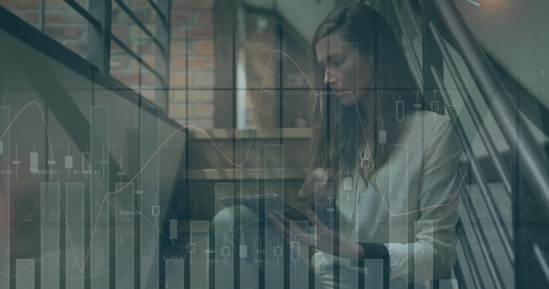 Woman is sitting on a staircase with her tablet looking at financial charts overlaid on the background, indicative of technological involvement in business and investments. Useful for articles about women in business, modern technology in finance, and graphical analyses in digital contexts.