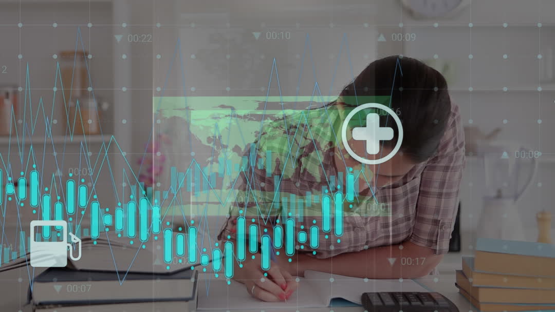 Woman multitasking with digital data on screen, ideal for illustrating themes of technology and remote work. Visuals include graphs and economy-related symbols, making it suitable for articles about digital innovation and economic analysis.