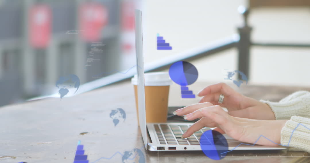 Woman working on laptop shows process of analyzing and handling digital data while enjoying coffee. Overlay of charts, globes, and computer code create sense of technology and global business. Useful for content related to business analysis, data management, remote work, tech industry innovations or corporate presentations.