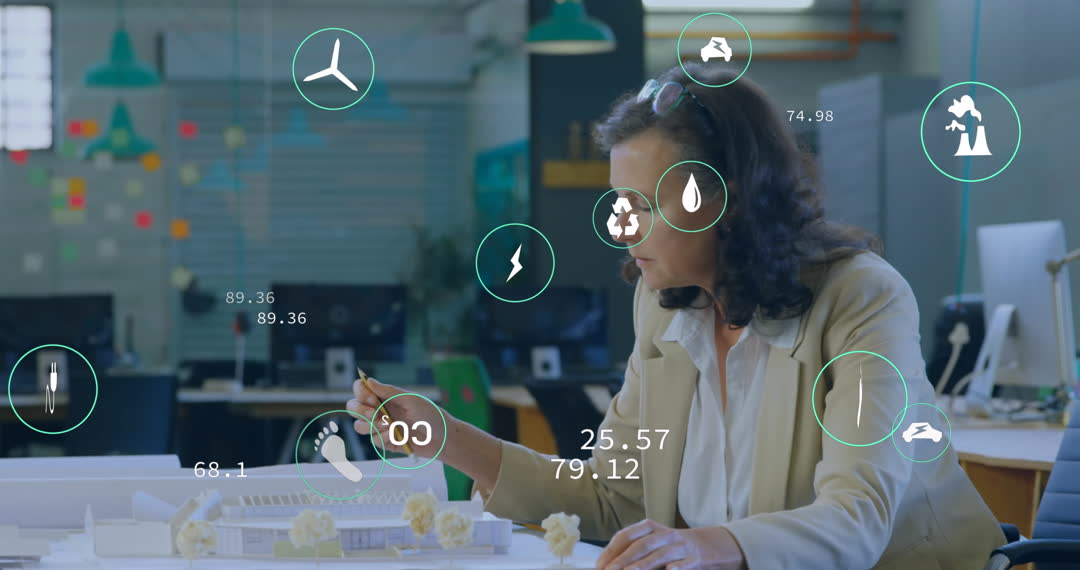 Image shows businesswoman engaged in analyzing a sustainable architectural model in a modern office setting. Surrounding digital icons highlight concepts related to ecology and renewable energy. Ideal for illustrating themes of eco-innovation, sustainable business strategies, and digital transformation in corporations.