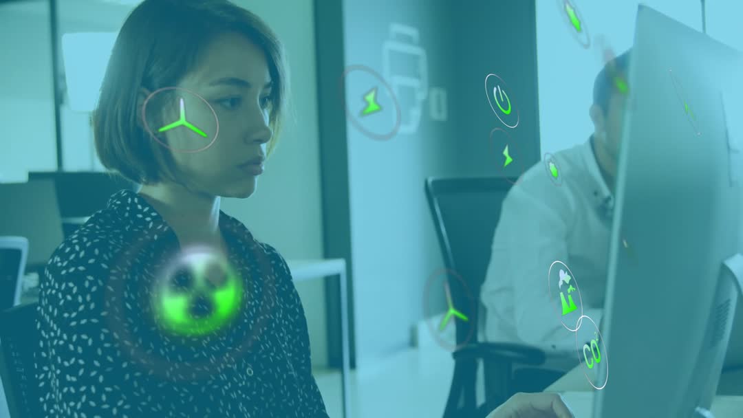 The video showcases a woman focused on her computer, surrounded by floating environmental icons representing carbon data and sustainability efforts. This representation exemplifies how modern technology contributes to understanding and monitoring ecological impact. Ideal for illustrating concepts in technological advancements, environmental awareness, corporate sustainability practices, and the integration of tech in ecological conservation efforts.