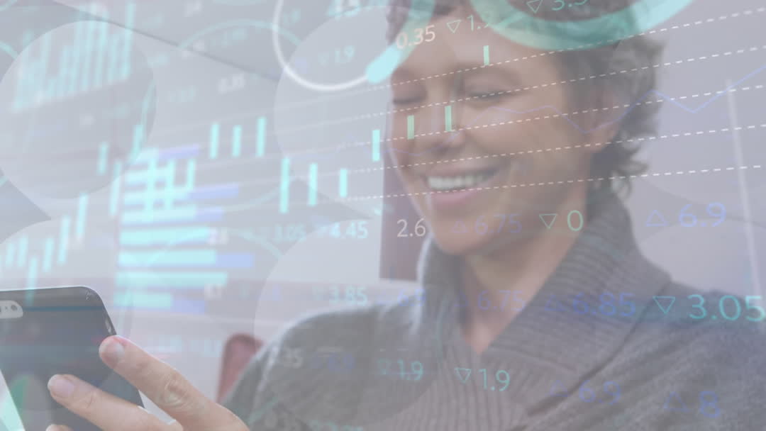 A smiling woman is using her smartphone in the comfort of her living room with overlaid graphics of fluctuating financial data, suggesting the use of mobile apps for stock trading and information access. This video is perfect for businesses or articles focusing on modern technology, remote stock trading, or personal finance apps.