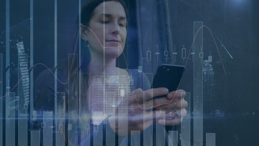 A woman in a city location using a smartphone, with overlay graphics depicting financial charts and candlesticks. Perfect for illustrating concepts of digital finance, modern business technology, or stock market analysis in promotional materials or articles related to finance, business, and technology trends.
