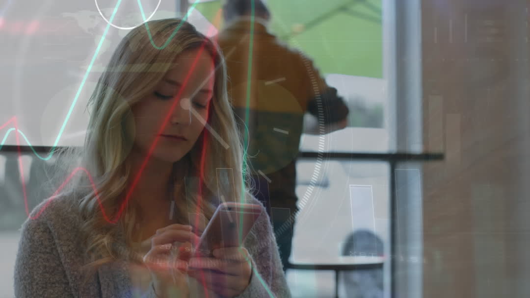 Woman Analyzing Financial Data on Smartphone Digital Overlay Video