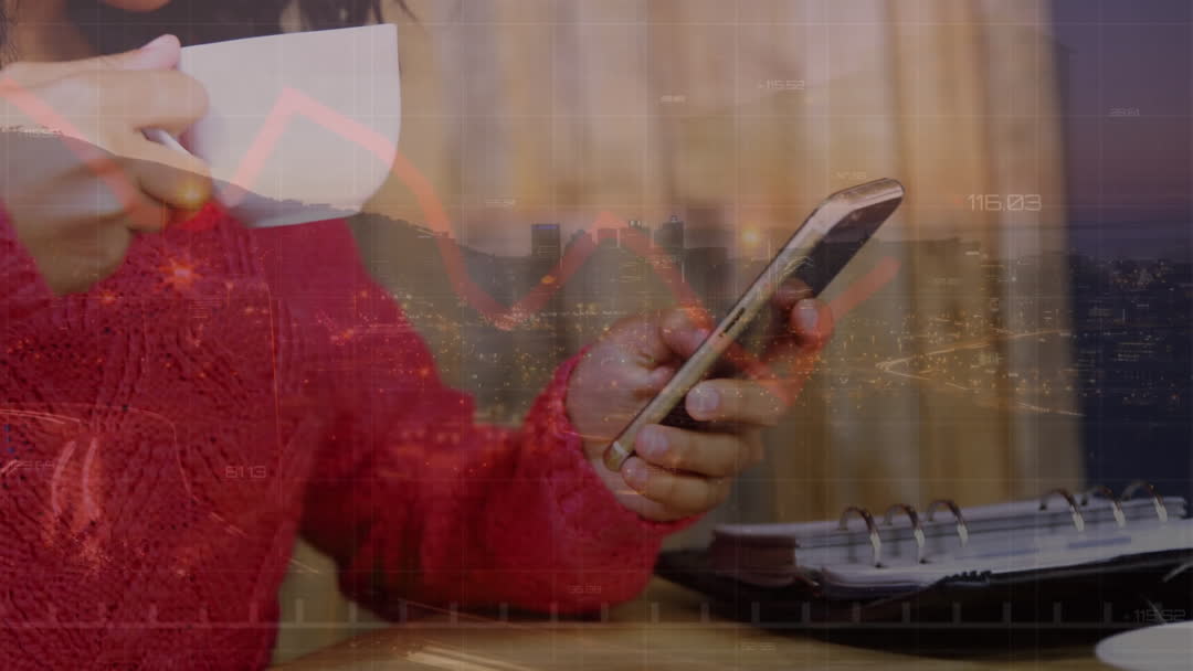 A woman in a red sweater multitasking by viewing financial data on her smartphone while enjoying a cup of coffee. A translucent financial graph overlays the scene, symbolizing the integration of technology in everyday life. This video is suitable for illustrating concepts related to business analytics, financial technology, mobile apps, and global markets in digital marketing materials and financial services advertisements.