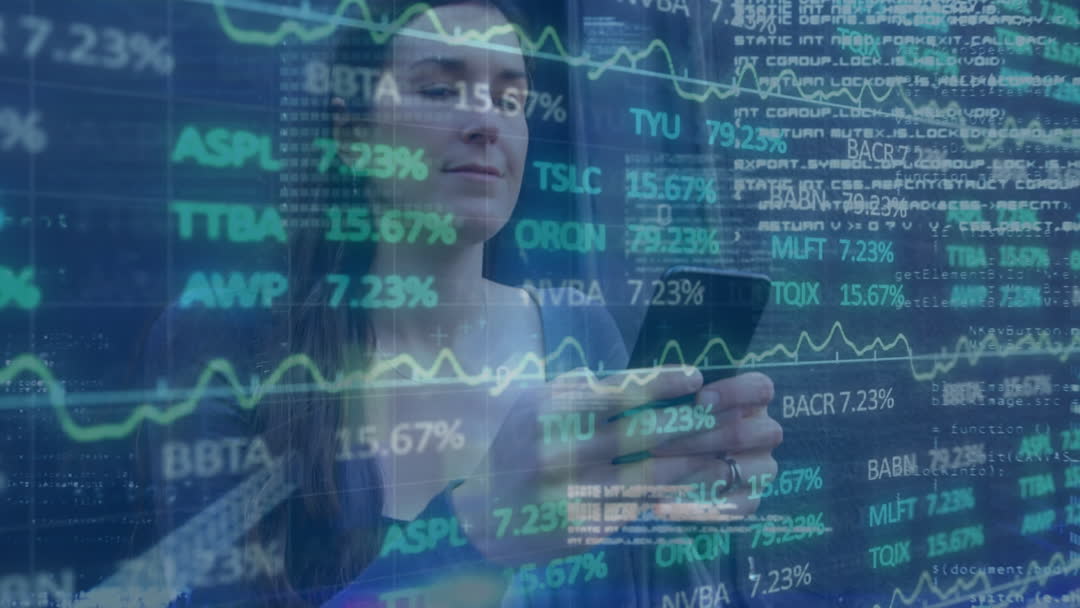 Image blends advanced financial data with focus on woman using smartphone, representing modern financial analysis and investment activities through mobile technology. Perfect for illustrating articles and presentations on finance, technology, stock market insights, business strategies, and global investments.