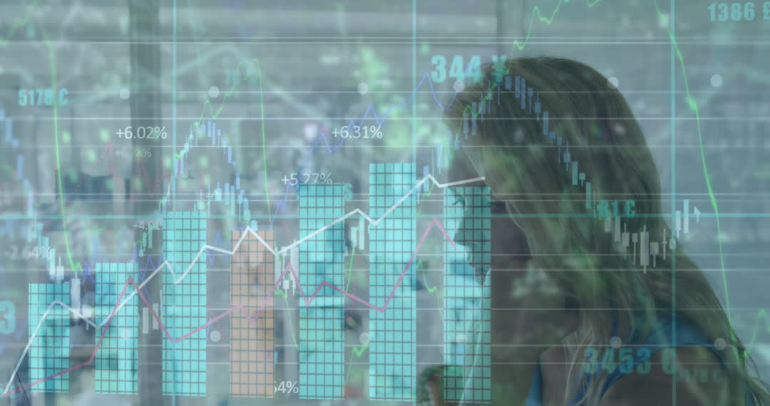 Woman Analyzing Financial Data with Digital Interface Overlay Video
