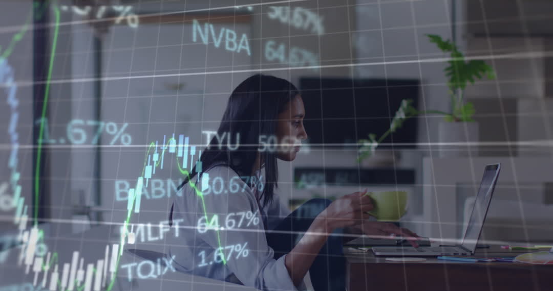 The video illustrates a woman focused on analyzing stock market data on her laptop, integrating elements of financial graphs. Useful for representing remote work, online trading, home-based business strategies, and economic analysis. Ideal for articles on personal finance, technology in investments, and remote work environment decorations.